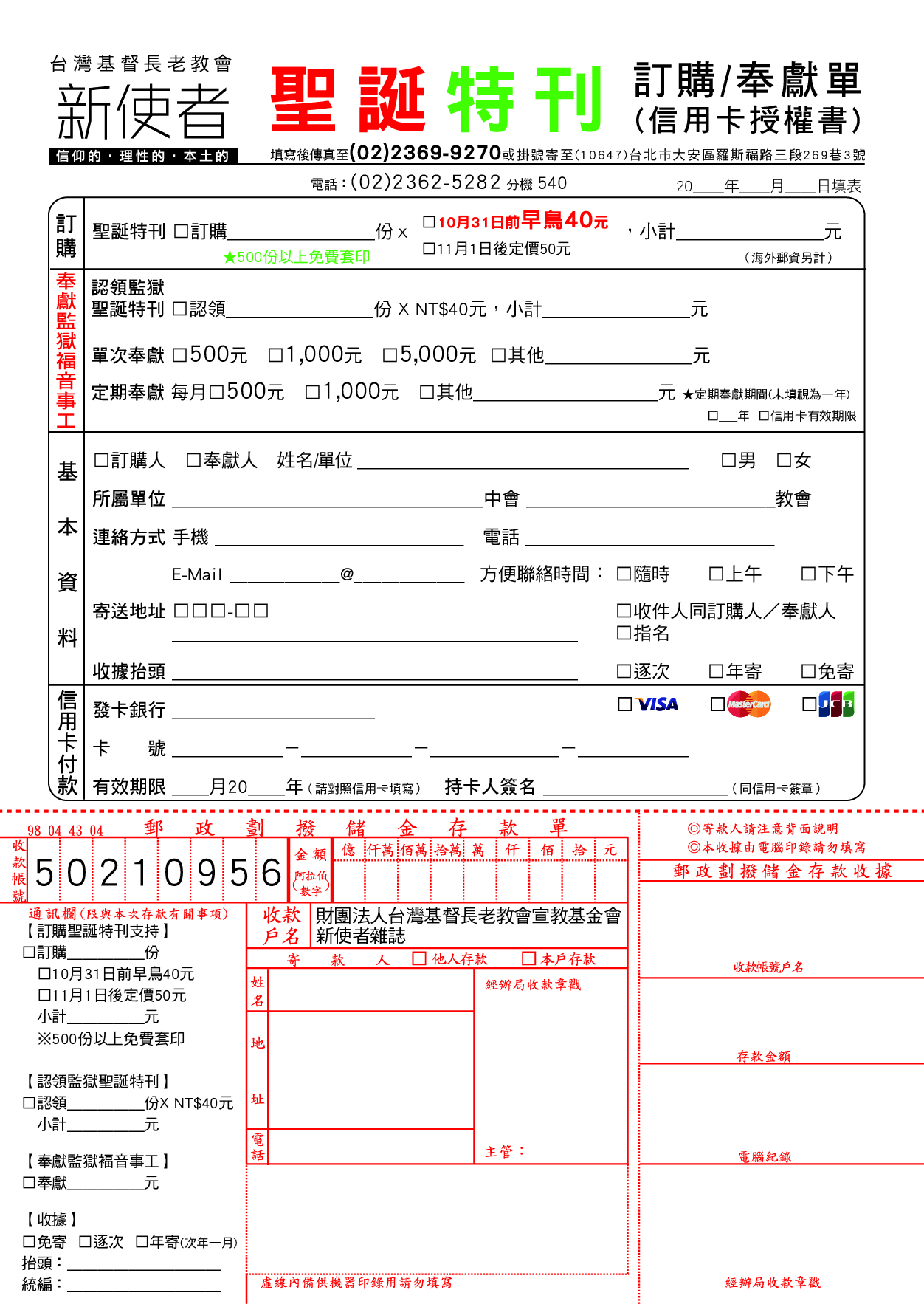 定價/50元 優惠價/40元 (10/31前訂購) (海外郵費另計) 凡訂購500份以上免費提供加印抬頭、聖經章節、單位連絡資訊等。 ★為縮短行政作業,懇請盡量以100份為單位購買,感謝您的支持。 【訂購方式】 電話:02-23625282分機540 劉姐妹 傳真:02-23699270 信箱:messenger@mail.pct.org.tw |