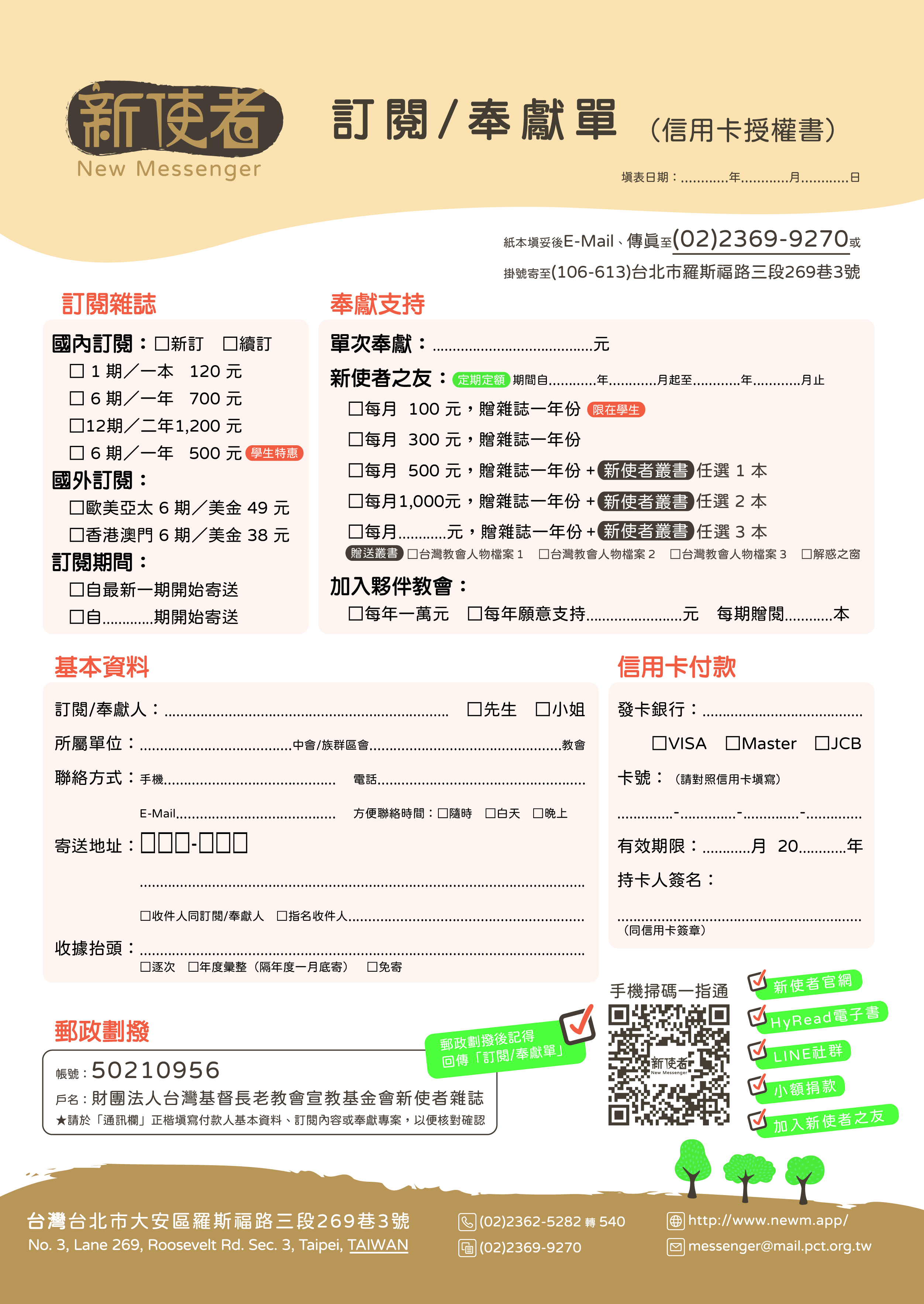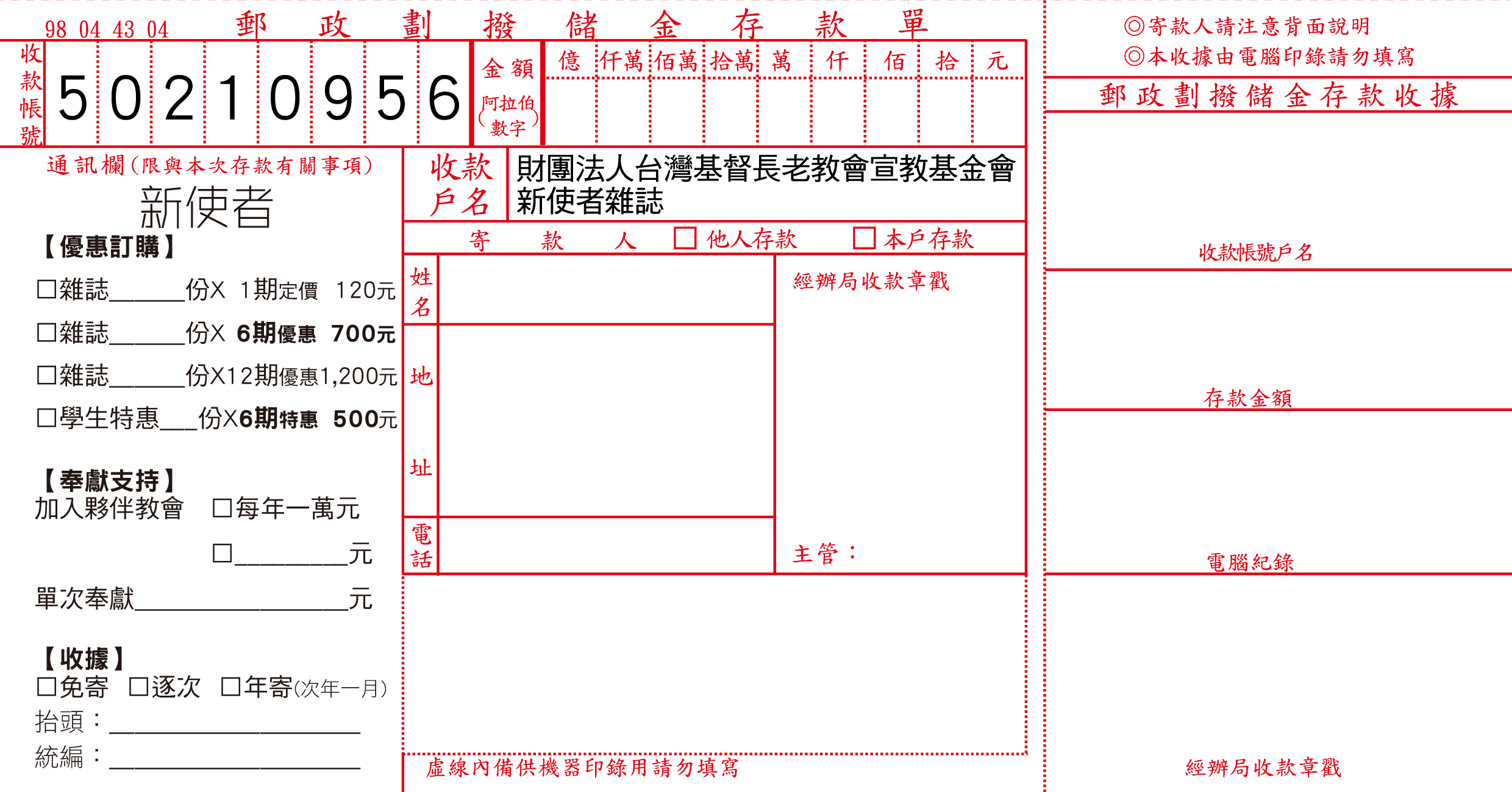 戶名:財團法人台灣基督長老教會宣教基金會新使者雜誌